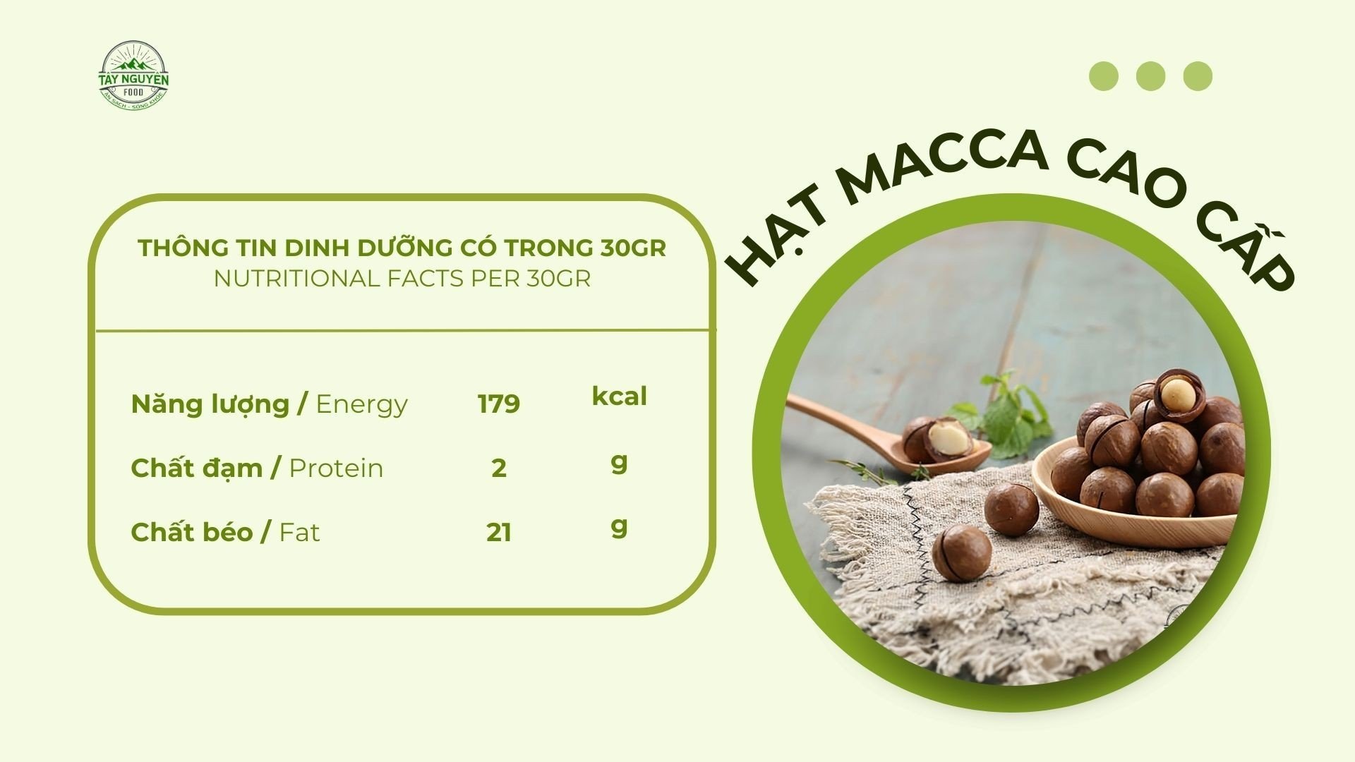 THÔNG TIN DINH DƯỠNG CÓ TRONG 30 GRAM HẠT MACCA NHÀ TÂY NGUYÊN FOOD – VIỆT NAM